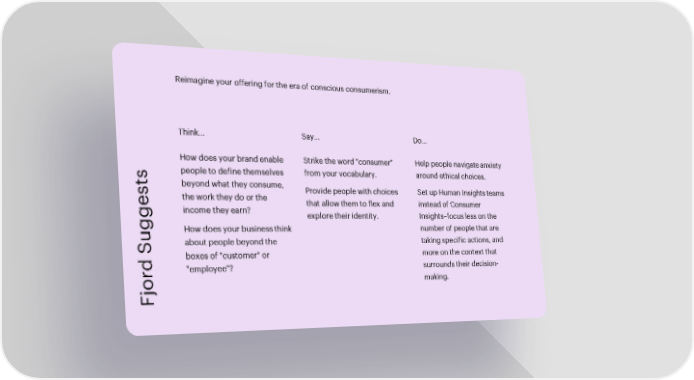 Reimagine your offering for the era of conscious consumerism. Think… Say… Do… How does your brandenable Strike the word "consumer" Help people navigateanxiety s people to define themselves from your vocabulary. around ethicalchoices. t beyond what they consume, Provide people withchoices Set up Human Insightsteams s the work they do or the income theyearn? that allow them to flex and instead of Consumer gge explore theiridentity. Insights–focus less on the How does your businessthink number of people that are Su about people beyond the taking specific actions, and d boxes of "customer" or more on the context that "employee"? surrounds their decision- or making. Fj