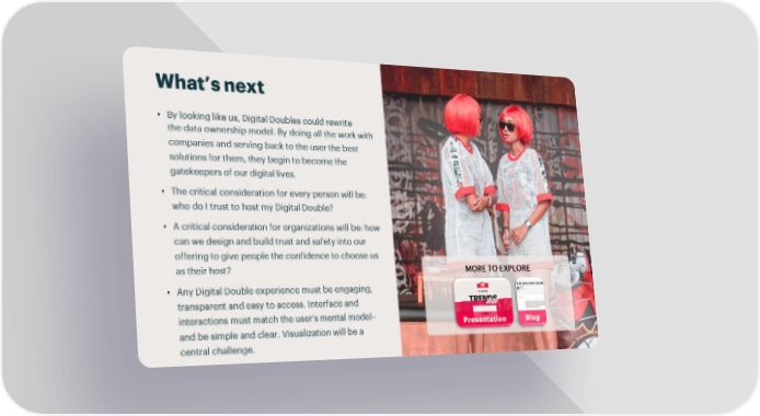What’s next • By looking like us, Digital Doubles could rewrite the data ownership model. By doing all the workwith companies and serving back to the user the best solutions for them, they begin to become the gatekeepers of our digitallives. • The critical consideration for every person willbe: who do I trust to host my DigitalDouble? • A critical consideration for organizations will be: how can we design and build trust and safety into our offering to give people the confidence to choose us as their host? MORE TO EXPLORE • Any Digital Double experience mu st be engaging, transparent and easy to access. Interface and interactions must match the user's mental model– and be simple and clear. Visualization will be a centralchallenge.