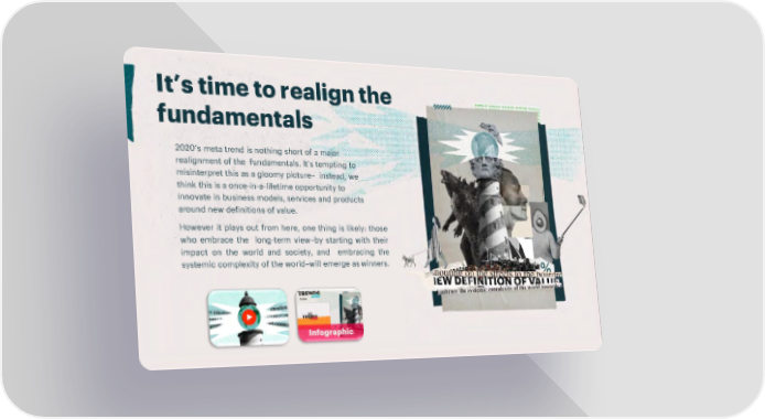 It’s time to realign the fundamentals 2020’s meta trend is nothing short of a major realignment of the fundamentals. It’s tempting to misinterpret this as a gloomy picture– instead, we think this is a once-in-a-lifetime opportunity to innovate in business models, services and products around new definitions ofvalue. However it plays out from here, one thing is likely: those who embrace the long-term view–by starting with their impact on the world and society, and embracing the systemic complexity of the world–will emerge aswinners.