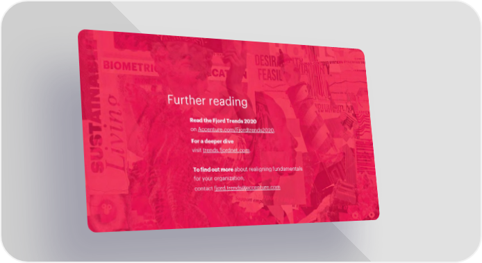 Further reading Read the Fjord Trends2020 onAccenture.com/Fjordtrends2020. For a deeperdive visit trends.fjordnet.com. To find out more about realigningfundamentals for your organization, contact [email protected]