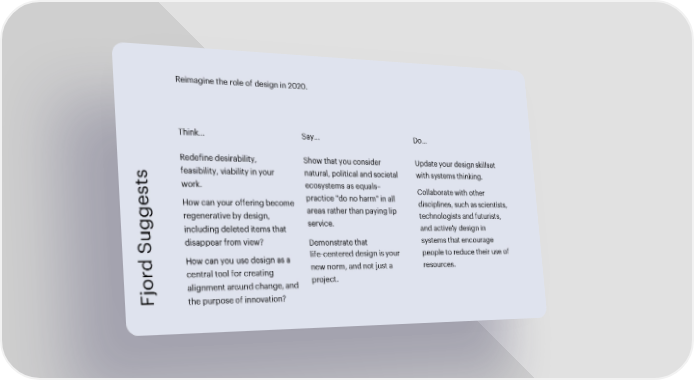 Reimagine the role of design in 2020. Think… Say… Do… Redefine desirability, Show that you consider Update your designskillset s feasibility, viability in your natural, political andsocietal with systems thinking. t work. ecosystems as equals– Collaborate with other s practice "do no harm" in all How can your offeringbecome areas rather than paying lip disciplines, such asscientists, gge regenerative by design, service. technologists and futurists, including deleted items that and actively design in Su disappear fromview? Demonstratethat systems that encourage d How can you use design as a life-centered design isyour people to reduce their use of central tool for creating new norm, and not just a resources. or alignment around change,and project. Fj the purpose ofinnovation?