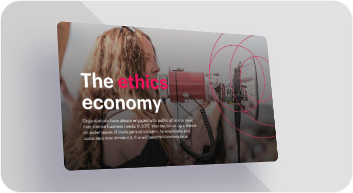 Theethics economy Organizations have always engaged with public affairs to meet their narrow business needs. In 2017, they began taking a stance on wider issues of more general concern. As employees and customers now demand it, this will become commonplace.