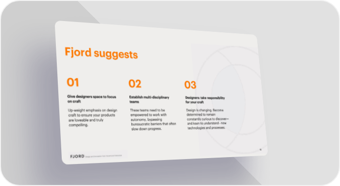 Fjord suggests 01 02 03 Give designers space to focus Establish multi-disciplinary Designers: take responsibility on craft teams for your craft Up-weight emphasis on design These teams need to be Design is changing. Become craft to ensure your products empowered to work with determined to remain are loveable and truly autonomy, bypassing constantly curious to discover— compelling. bureaucratic barriers that often and keen to understand—new slow down progress. technologies and processes.