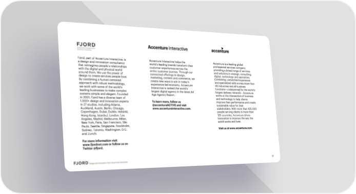 Fjord, part of Accenture Interactive, is Accenture Interactive helps the Accenture is a leading global a design and innovation consultancy world’s leading brands transform their professional services company, that reimagines people’s relationships customer experiences across the providing a broad range of services with the digital and physical world entire customer journey. Through our and solutions in strategy, consulting, around them. We use the power of connected offerings in design, digital, technology and operations. design to create services people love. marketing, content and commerce, we Combining unmatched experience By combining a human-centered create new ways to win in today’s and specialized skills across more than approach with robust methodology, experience-led economy. Accenture 40 industries and all business we work with some of the world’s Interactive is ranked the world’s functions—underpinned by the world’s leading businesses to make complex largest digital agency in the latest Ad largest delivery network— Accenture systems simple and elegant. Founded Age Agency Report. works at the intersection of business in 2001, Fjord has a diverse team of and technology to help clients 1,000+ design and innovation experts To learn more, follow us improve their performance and create in 27 studios, including Atlanta, @accentureACTIVE and visit sustainable value for their Auckland, Austin, Berlin, Chicago, www.accentureinteractive.com. stakeholders. With more than 425,000 Copenhagen, Dubai, Dublin, Helsinki, people serving clients in more than Hong Kong, Istanbul, London, Los 120 countries, Accenture drives Angeles, Madrid, Melbourne, Milan, innovation to improve the way the New York, Paris, San Francisco, S!o world works and lives. Paulo, Seattle, Singapore, Stockholm, Sydney, Toronto, Washington, D.C. Visit us at www.accenture.com. and Zurich. For more information visit www.fjordnet.com or follow us on Twitter @fjord.